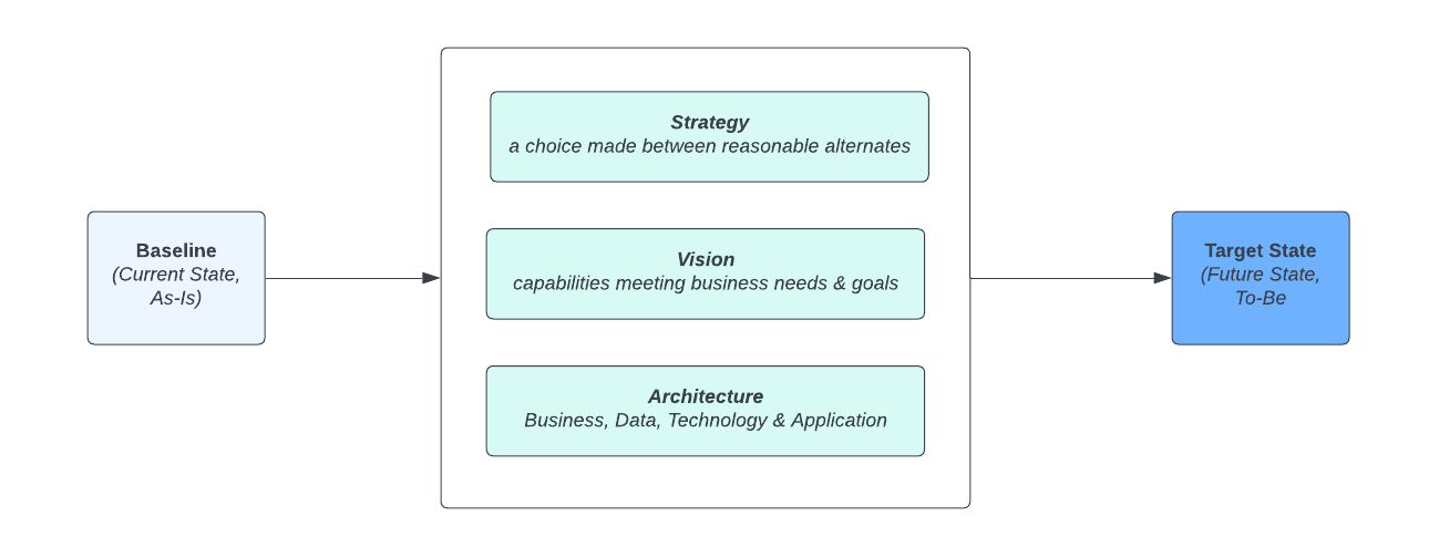 Firstly, let’s grasp EA at a high-level view. At its core, EA involves documenting the current state of the organization, aligning with its strategy, vision, and architectural elements, and charting a future state. There exist various frameworks and models for this process, which we’ll explore in a future article.