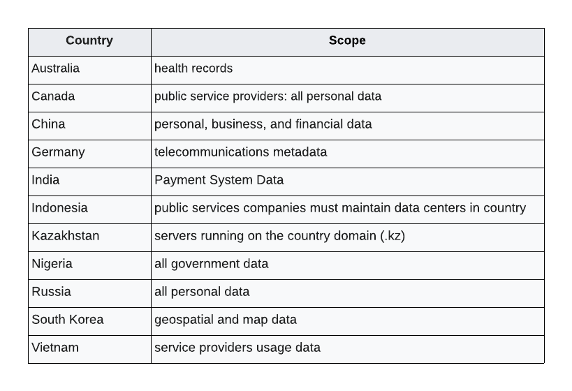 There are no international laws which restrict the data movement yet. Each country started defining its own laws and scope of data which falls under the law. For example, below are few countries and their respective scoped data:
